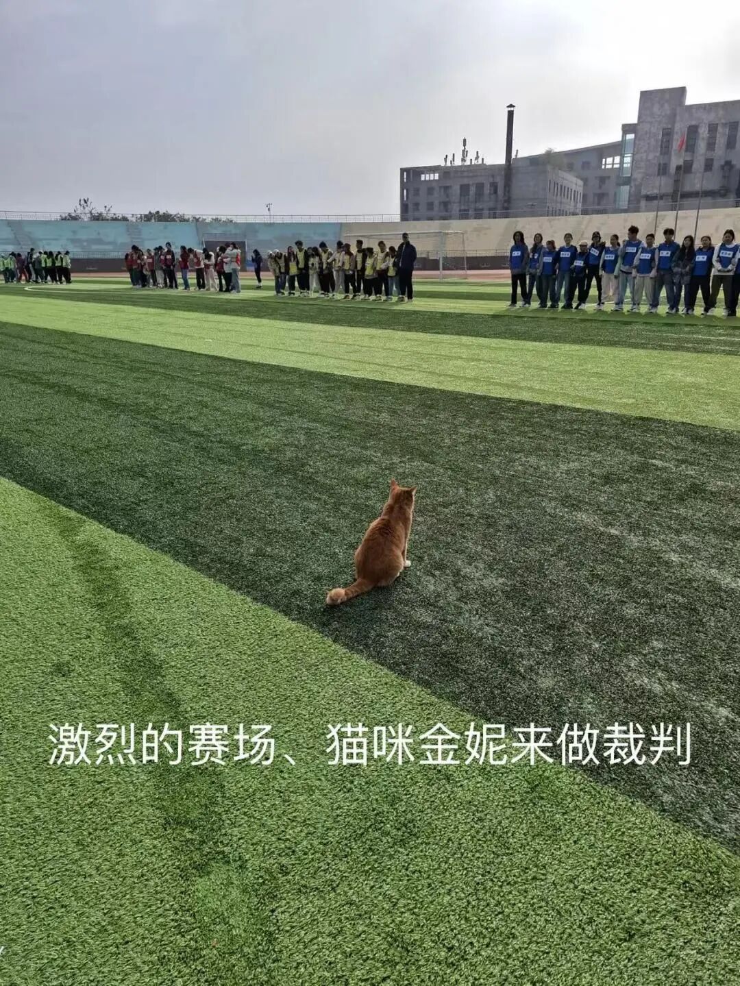 旁侧橘猫学长蹲坐,尾巴扫草叶